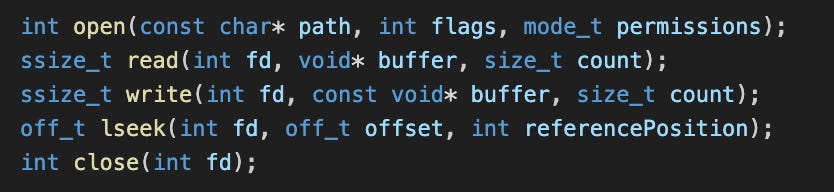 This represents the signatures of the five basic I/O UNIX system calls: