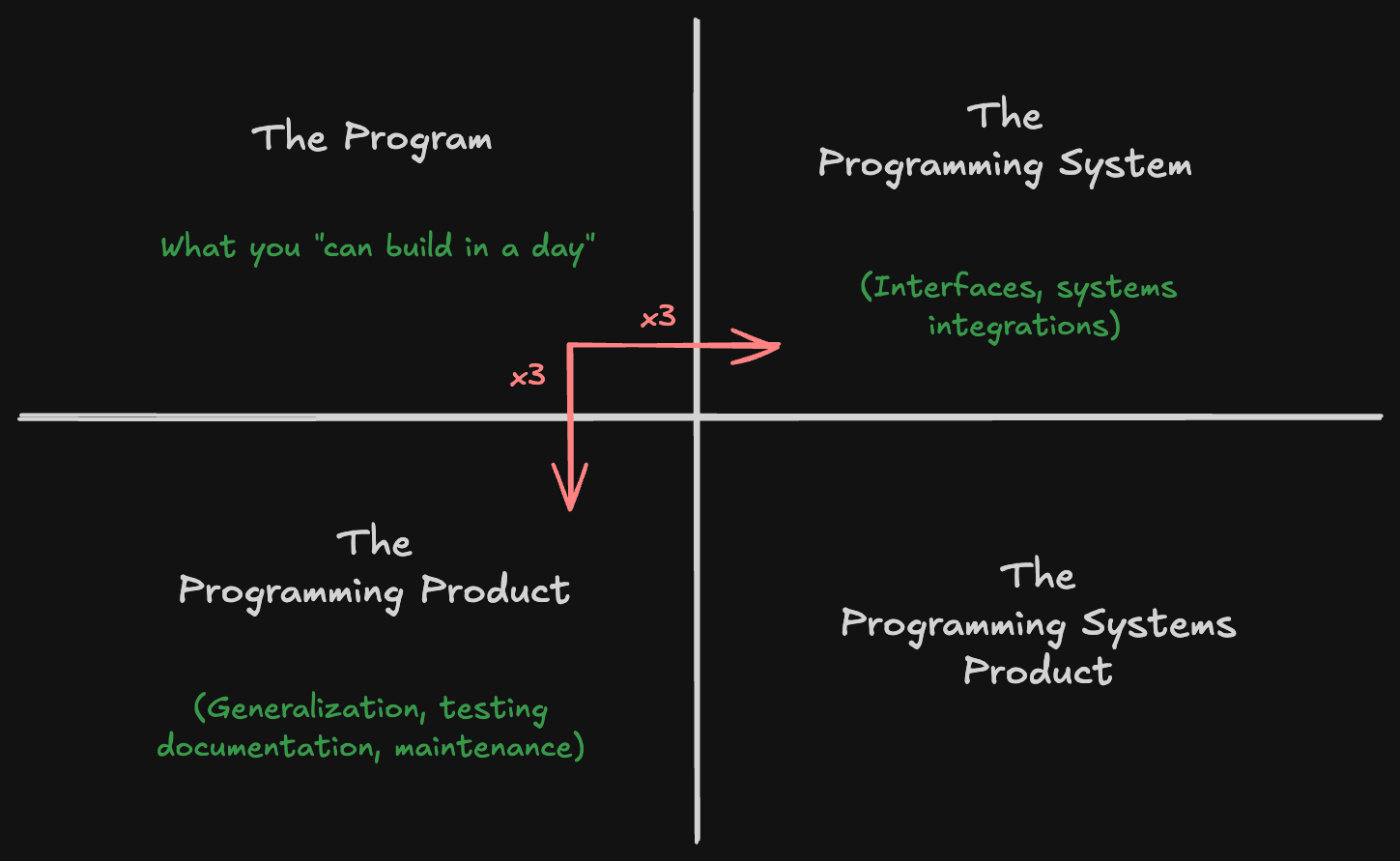 The “built in a day” fallacy hasn’t disappeared. It has simply shifted its coordinates. AI has commoditized the first quadrant, turning the “Program” into a disposable artifact. But the remaining work of hardening, integrating, and distributing remains as resistant to shortcuts as it was in 1975.